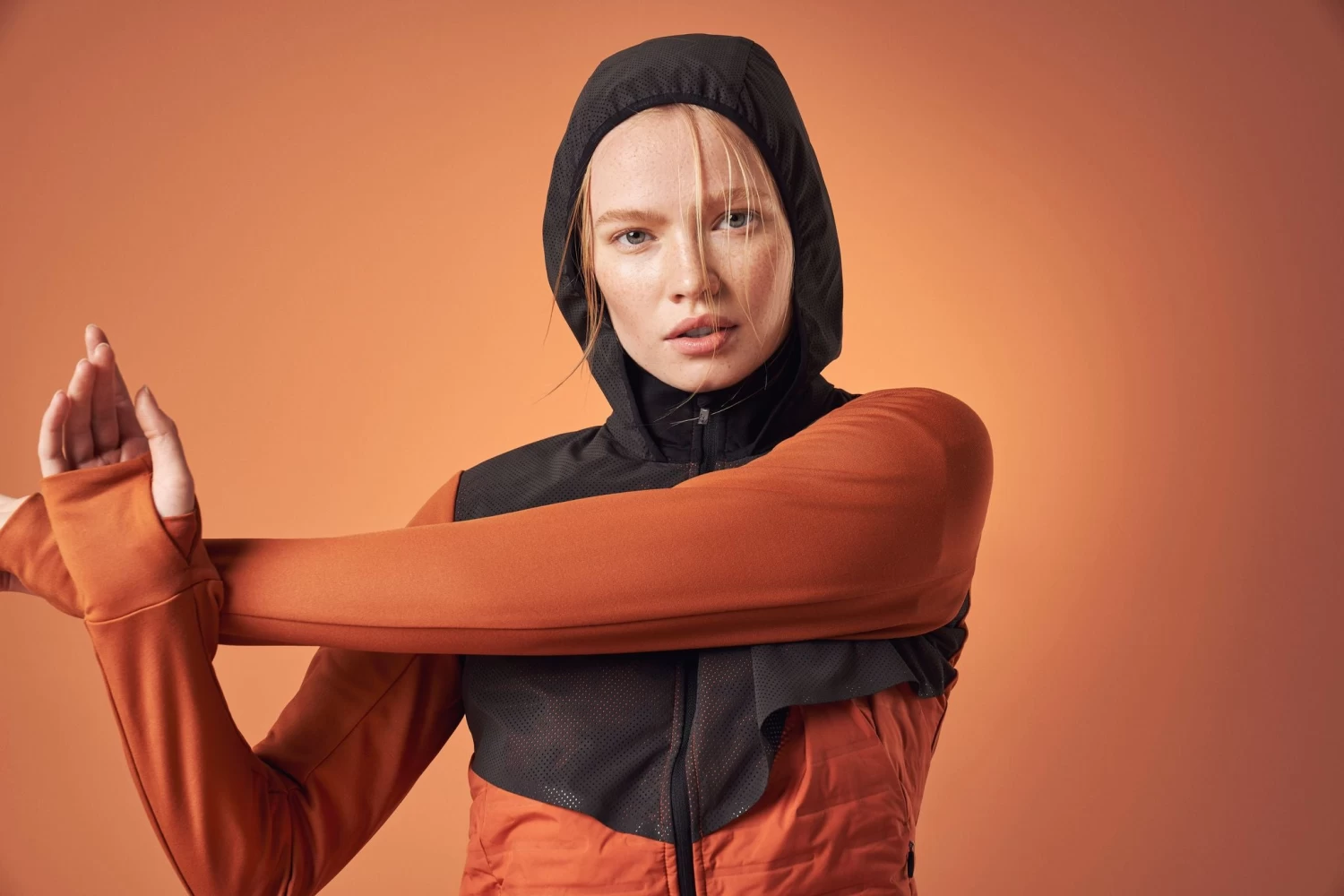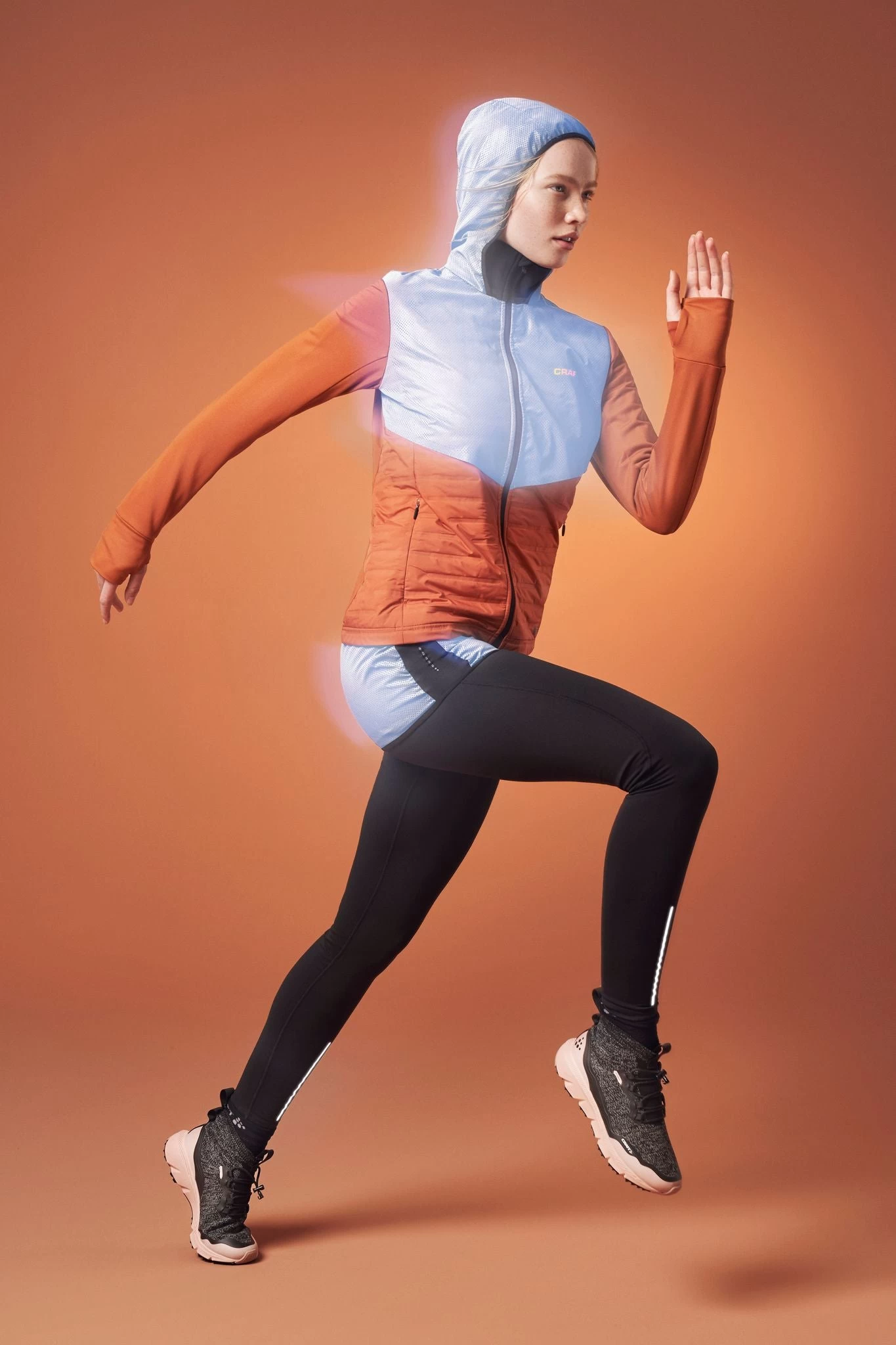 Running hooded jacket with light padding andย heat-bonded quilting at front for warmth and comfort. Soft jersey hood and brushed jersey at sleeves and back for moisture control and comfort. Reflective perforated fabric on top of yoke for enhanced visibility.