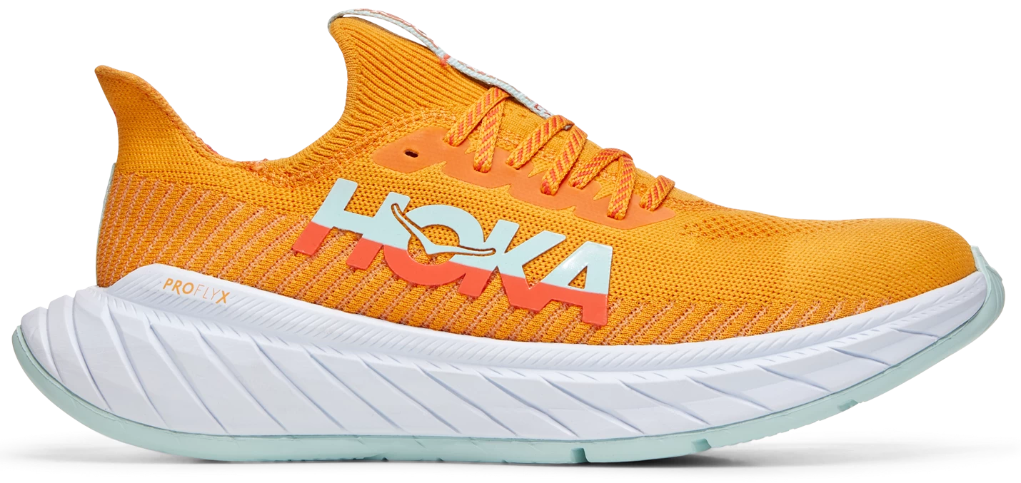 Positioned as an endurance racer, the Carbon X 3 delivers an even more propulsive speed than its predecessor in an adaptable silhouette geared for training and racing alike. Engineered with a responsive, carbon fiber plate and aggressive Meta-Rocker, this performance shoe is a formidable competitor. The epitome of long-range weaponry, the Carbon X 3 pairs softer, lighter foam with the same rubberized foam outsole as the last iteration. The Carbon X 3 employs a refined collar shape, notched tongue, and a new engineered knit upper for an improved fit and extra reinforcement around the laces. Get ready for an inherently soft, stable, and responsive ride.