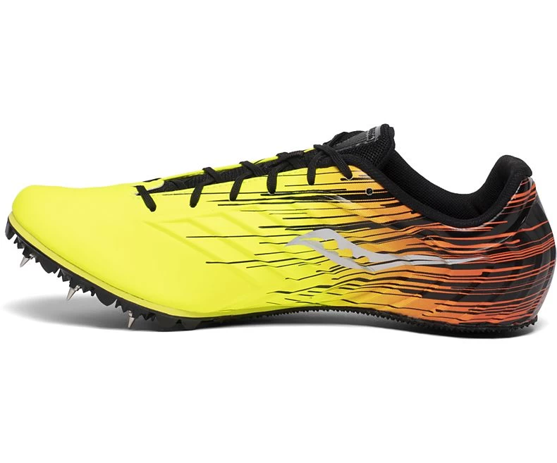 The new Saucony Spitfire is sleek, fast, and unique. With a styling like no other, the Spitfire is ready to do some damage. With a 7 pin spike plate, you will surely be able to get great traction and speed. The synthetic upper and molded quarter cage will provide a secure fit so you can have a smooth quick race.